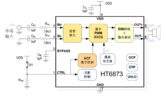 UTC5813是一款高保真超低EMI的,具有防削頂失真功能的單聲道免濾波D類音頻功率放大器。在5V電源,10% THD+N,4Ω負(fù)載條件下,輸出3.5W高功率,在各類音頻終端應(yīng)用中維持高效率并提供AB類放大器高保真、低噪聲的性能。